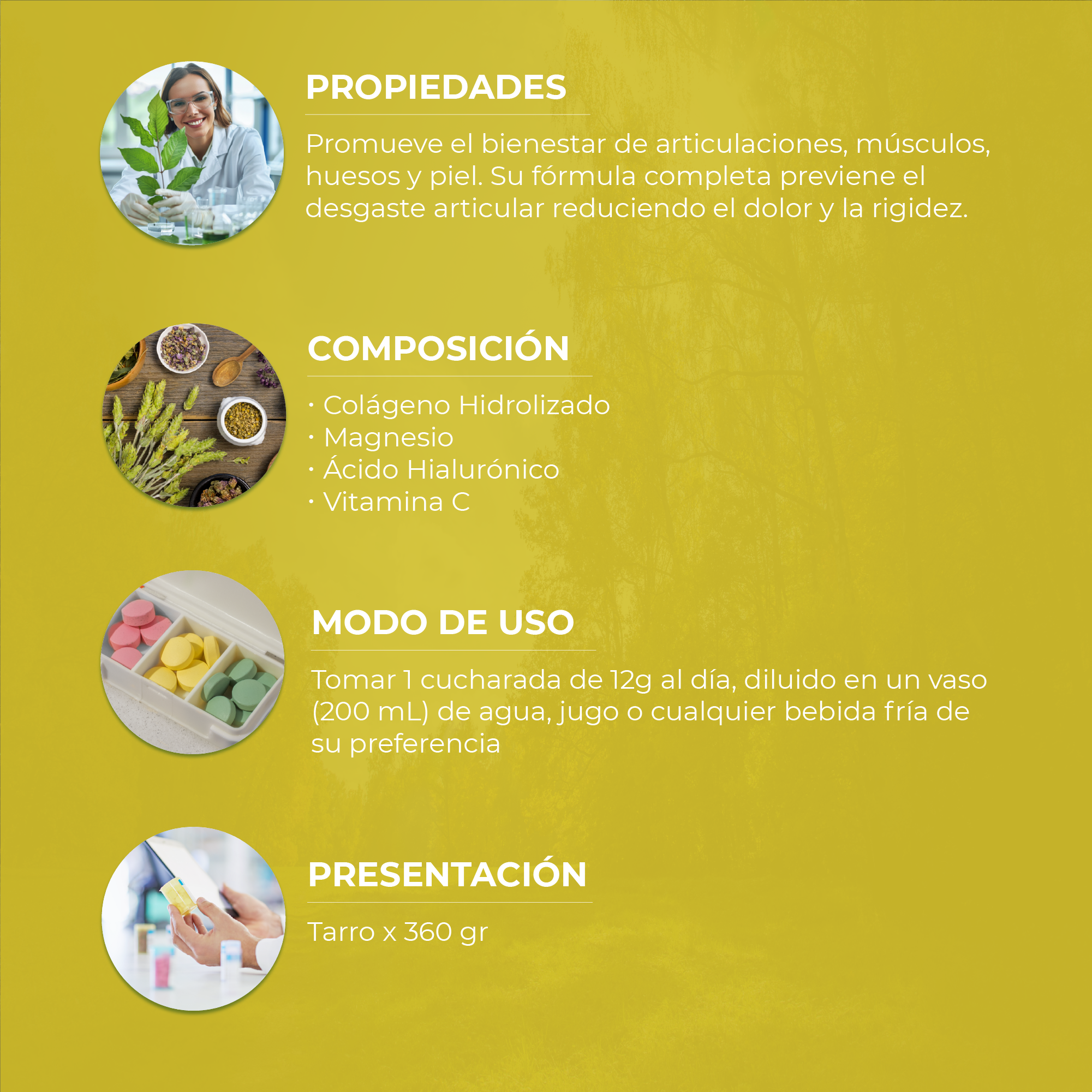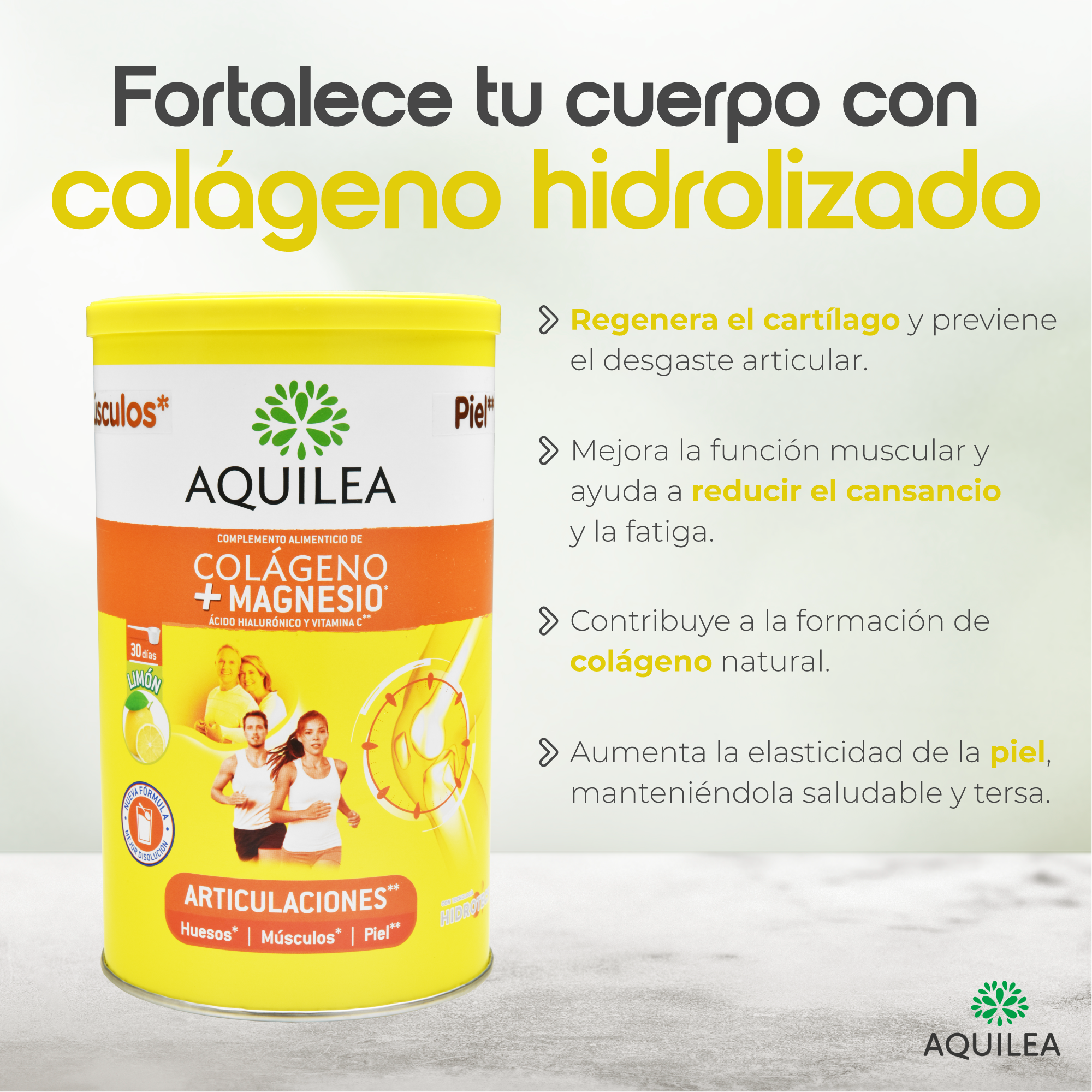 Nuestra fórmula de colágeno hidrolizado, magnesio, ácido hialurónico y vitamina C fortalece tus articulaciones, huesos, músculos y piel.