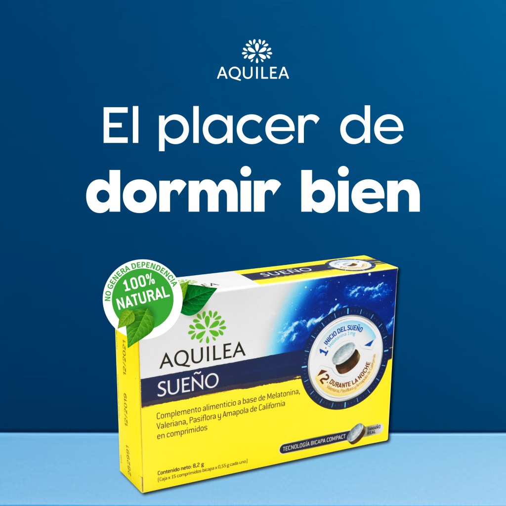 Aquilea Sueño es un complemento alimenticio formulado con ingredientes naturales como melatonina, valeriana, pasiflora y amapola de California, diseñado para mejorar la calidad del descanso nocturno.